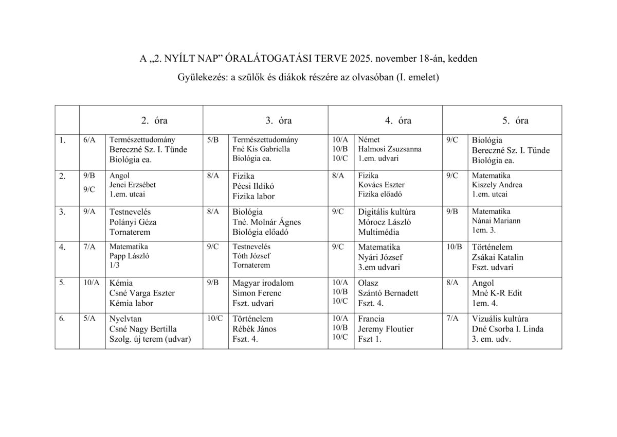 Ezeken a napokon az órarend szerinti tanórákba kínálunk betekintést. A alkalmakra nincs előzetes regisztráció, a helyszínen lehet feliratkozni a terem férőhelyeinek mértékéig. Az érdeklődők mindhárom napon 8:30-tól a gimnázium olvasótermében az iskolavezetéstől személyesen is kérhetnek tájékoztatást a képzésekről, a felvételi eljárásról, feltehetik kérdéseiket.