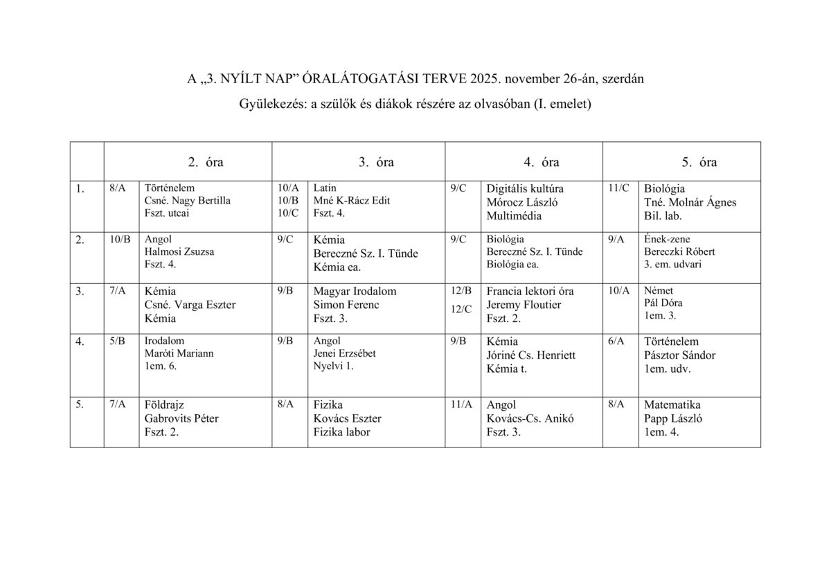 Ezeken a napokon az órarend szerinti tanórákba kínálunk betekintést. A alkalmakra nincs előzetes regisztráció, a helyszínen lehet feliratkozni a terem férőhelyeinek mértékéig. Az érdeklődők mindhárom napon 8:30-tól a gimnázium olvasótermében az iskolavezetéstől személyesen is kérhetnek tájékoztatást a képzésekről, a felvételi eljárásról, feltehetik kérdéseiket.